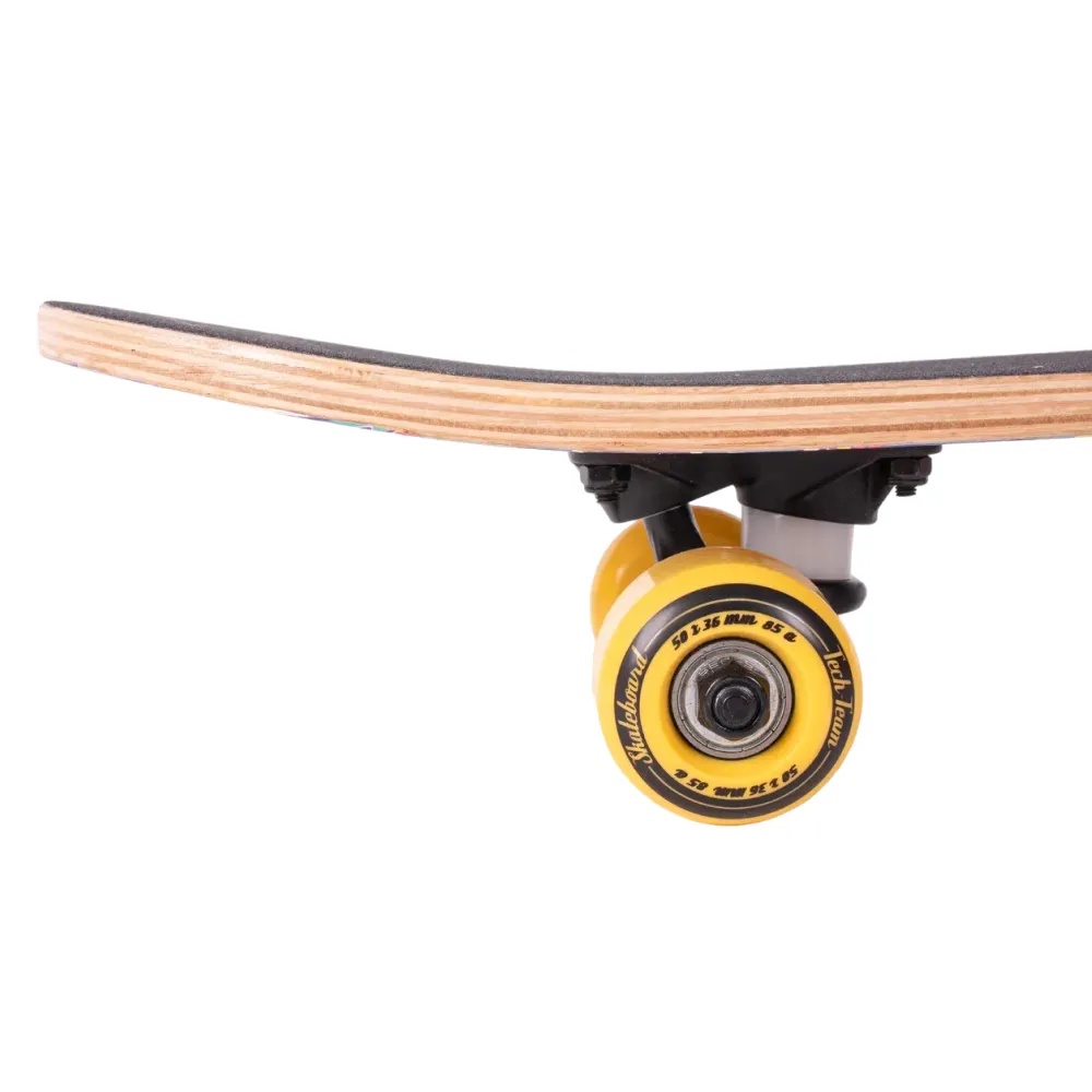 Скейтборд Tech Team Profi 2024 желтый - это смелый выбор для тех, кто ценит качество и стиль. С этим скейтбордом вы заметите, как город оживает под колесами из полиуретана размером 50x36 мм, обеспечивающих оптимальную жесткость 85А. Дека из 9 слоев прочного китайского клена гарантируют устойчивость и долговечность, а ее размеры 24”х6” обеспечивают максимальный комфорт при катании. Верхняя часть покрыта чёрной шкуркой 80AB для непревзойденного сцепления, а нижняя часть украшена эксклюзивным принтом в жёлтых тонах, вдохновленным винтажными наклейками. Скейтборд оснащен подшипниками ABEC 5 для плавного и быстрого движения, а двойной концевой загиб Деки (Double Kick) позволяет выполнять трюки с легкостью. Это не просто скейтборд, это способ выразить себя.