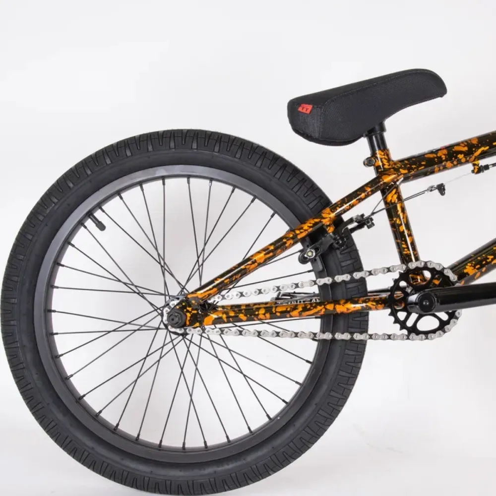 Рама велика изготовлена из ударопрочной надежной стали, выдерживает максимальные нагрузки, не деформируется при сложных прыжках. 20-дюймовая колесная часть с передней алюминиевой втулкой QUANDO, 6061-T6, с 36 спицами и осью размером 3/8", OLD 100 мм и задней алюминиевой втулкой QUANDO, 6061-T6, с 36 спицами и осью размером 12мм, OLD 110 мм, подшипники пром.+сепараторный улучшает спортивные показатели, делает их качественными. Модель оснащена удобным рулем и нескользящими прорезиненными грипсами.